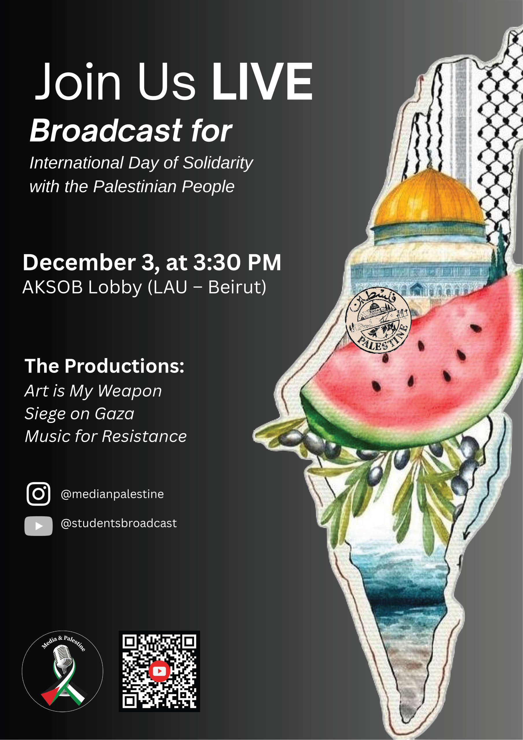 Students from the Media and Palestine course at the Lebanese American University in Beirut, Lebanon, will host a live broadcast on Wednesday, December 3rd. The online broadcast will be held at 3:30pm al-Quds time. The broadcast will feature students hosting live content and airing their produced videos. This is a student led activity in honor of the International Day of Solidarity with the Palestinian People.